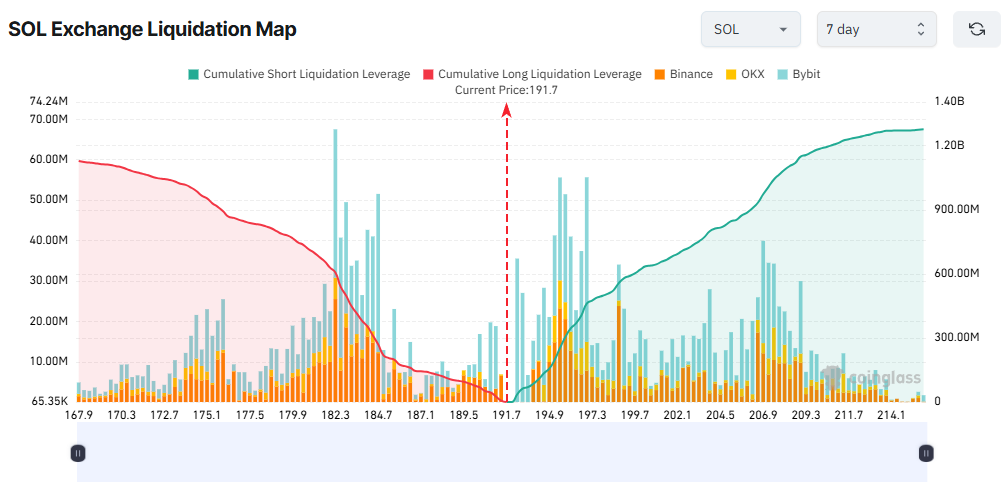 清算マップによると、SOLの現在の価格水準が191ドル付近で推移するなか、200ドルを超える動きが生じた場合、ショートポジションで6億ドル以上の清算が発生する可能性がある。反対に、181ドルまで価格が下落すれば、ロングポジションの清算額が7億ドル以上に達する可能性もある。