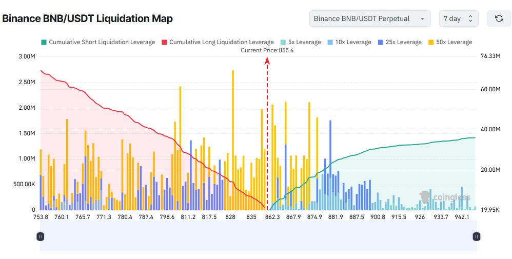 Binanceだけを見ると、ロングの清算がショートの清算を上回っている状況である。BNB価格が875ドルを超えた場合、ショートポジションで最大1,850万ドル相当の清算が起きる可能性がある。一方で、BNBが心理的節目である800ドルを割り込めば、ロングポジションで3,600万ドルを超える清算が発生するとみられる。