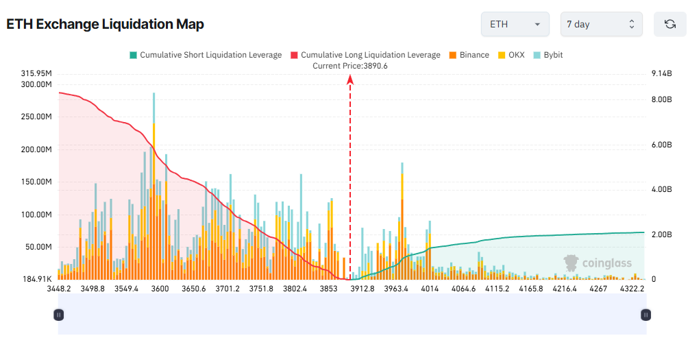 Coinglassのデータによると、イーサリアム(ETH)の価格が4,000ドルを超えた場合、ショートポジションの累積清算額は最大で12億ドルに達する可能性がある。一方、ETHが利益確定の動きから3,500ドルまで下落すると、ロングポジションの清算規模は最大78億ドルに達する恐れがあるという。