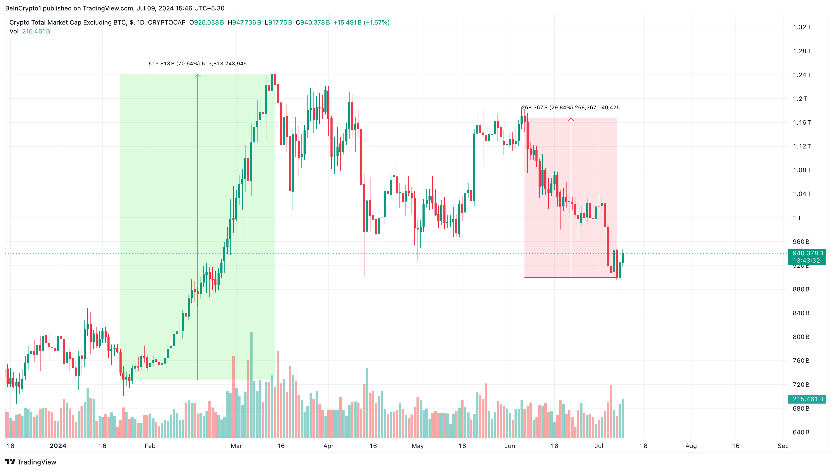 しかし、減少はビットコインが市場を支配していることを意味する。報道時点では、アルトコインの時価総額は9,403億7,000万ドルで、過去24時間で4.87%増加している。同じ時価総額は当初、6月6日から7月8日の間に23.26%減少していた。