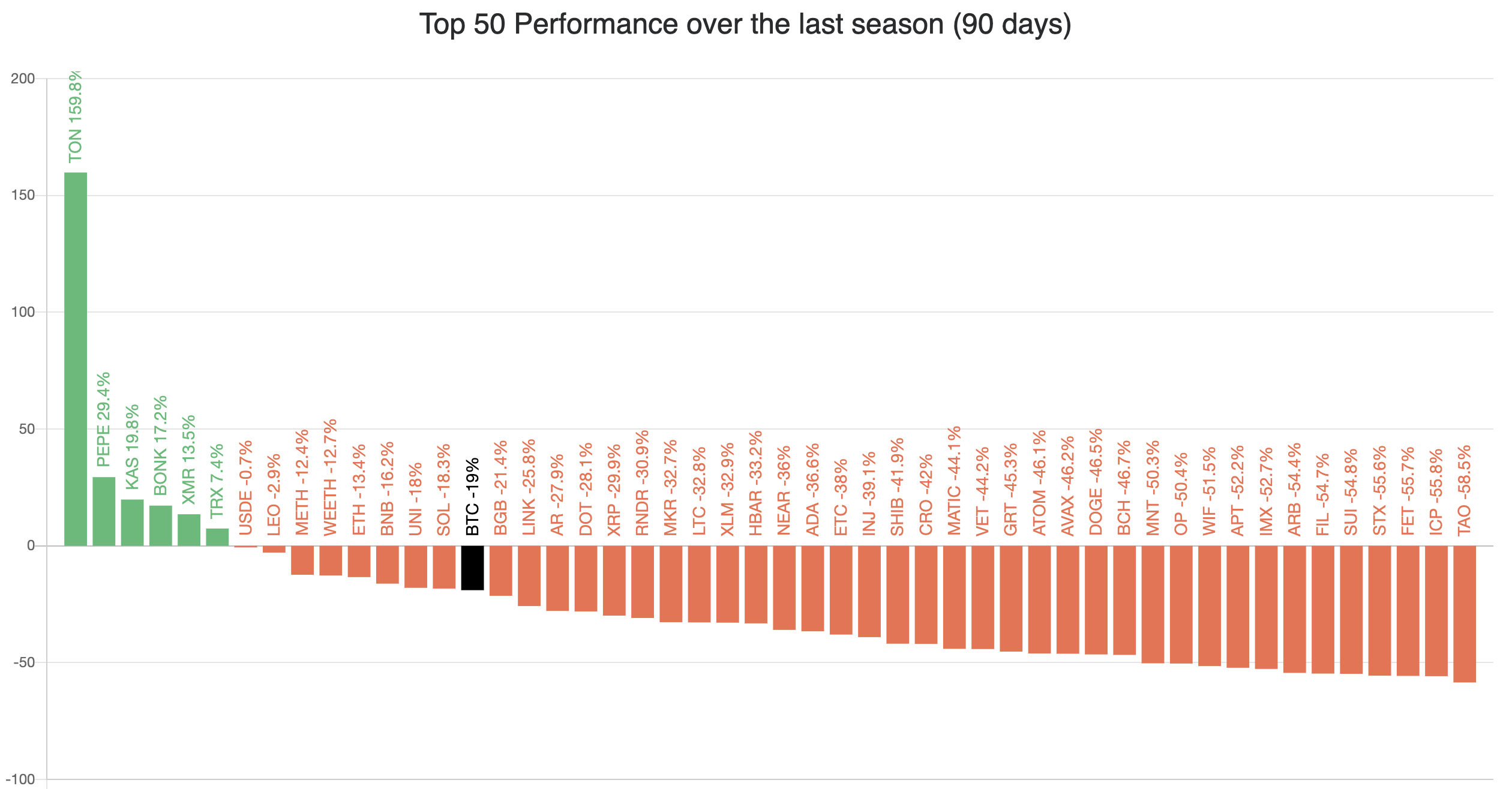 SponsoredBlockchaincenterのデータによると、ミームコインを含む数種類の暗号通貨のみがそれを達成している。その中には、Toncoin(TON)、Pepe(PEPE)、Kaspa(KAS)、Bonk(BONK)などが含まれる。