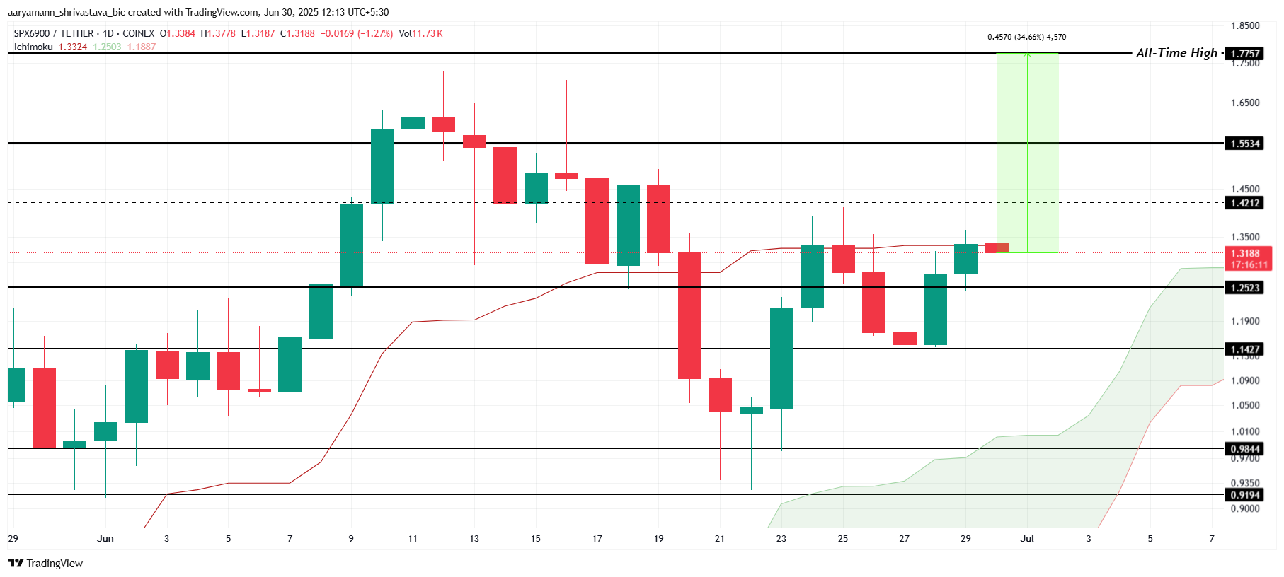 1.42ドルを達成し確保することが、SPXが1.55ドルに向けて押し上げるために重要である。これにより、アルトコインは過去最高値の1.77ドルを目指す道が開かれる。これは34.6%の距離にある。Ichimoku Cloudの上昇シグナルがこの可能性を支持しており、市場条件が好ましいままであれば、SPXは上昇の勢いを続ける可能性がある。