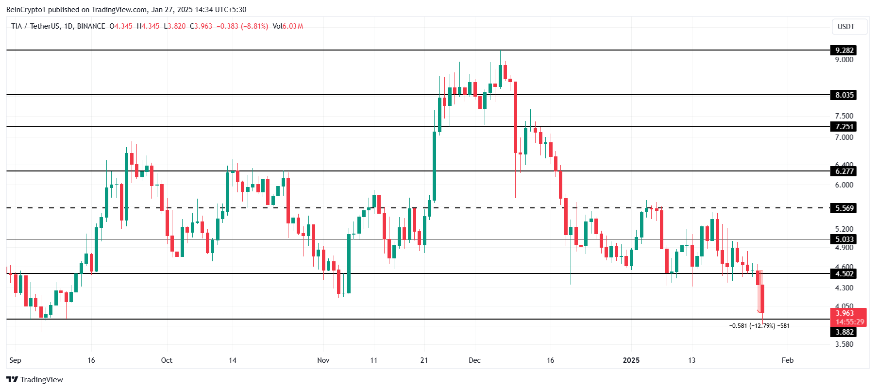 TIAは過去24時間で12%下落し、現在3.96ドルで取引されている。この下落にもかかわらず、アルトコインは3.88ドルの重要なサポートレベルを上回っており、さらなる下落を避けるための鍵となっている。