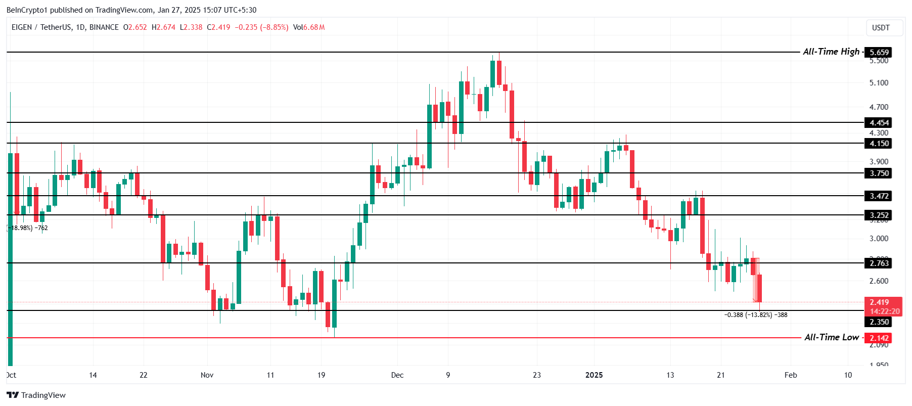 注目すべきもう一つの主要なアルトコインはEigenLayerである。EIGENの価格は日次チャートで約14%下落し、現在2.41ドルで取引されている。この下落にもかかわらず、暗号資産は2.35ドルの重要なサポートレベルを上回っており、投資家は市場の変動の中でEIGENがこのサポートを維持できるかどうかを注視している。