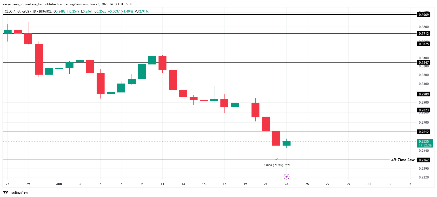 CELOは今月最もパフォーマンスの悪いトークンの1つで、過去24時間で新たな最安値に落ち込んだ。9.8%の1日内下落により、アルトコインは0.236ドルに滑り落ちた。しかし、その後わずかに回復し、現在0.252ドルで取引されており、投資家は次の動静を注視している。