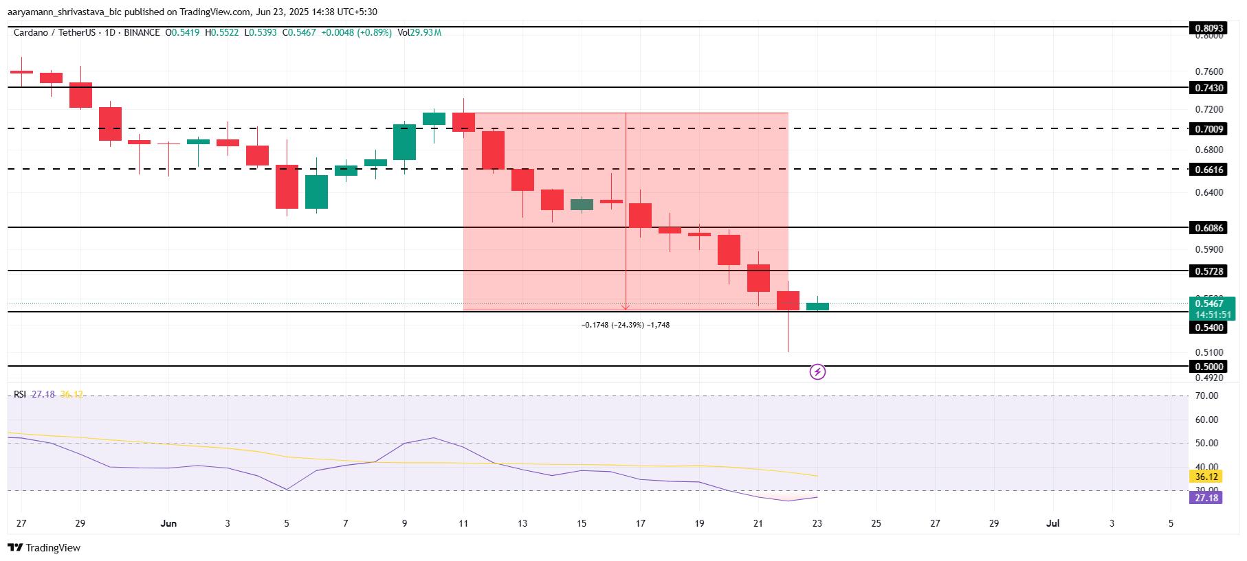 もしカルダノがReeveの開始からの勢いを活かせなければ、0.500ドルに戻る可能性がある。しかし、RSIは現在売られ過ぎのゾーンにあり、今後数日で価格の反転が起こる可能性を示唆している。これにより、カルダノが勢いを取り戻し、回復を続けるための動力を得る可能性がある。