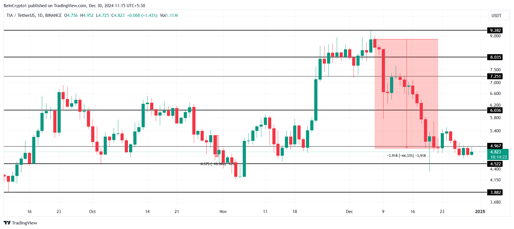 SponsoredジンジャーアップグレードはTIAの価格に影響を与えると予想されます。特にアルトコインが12月初旬のクラッシュで44%下落した後です。現在4.82ドルで取引されているTIAのパフォーマンスは、市場がアップグレードを回復の触媒と見るか、さらなるボラティリティと見るかにかかっています。