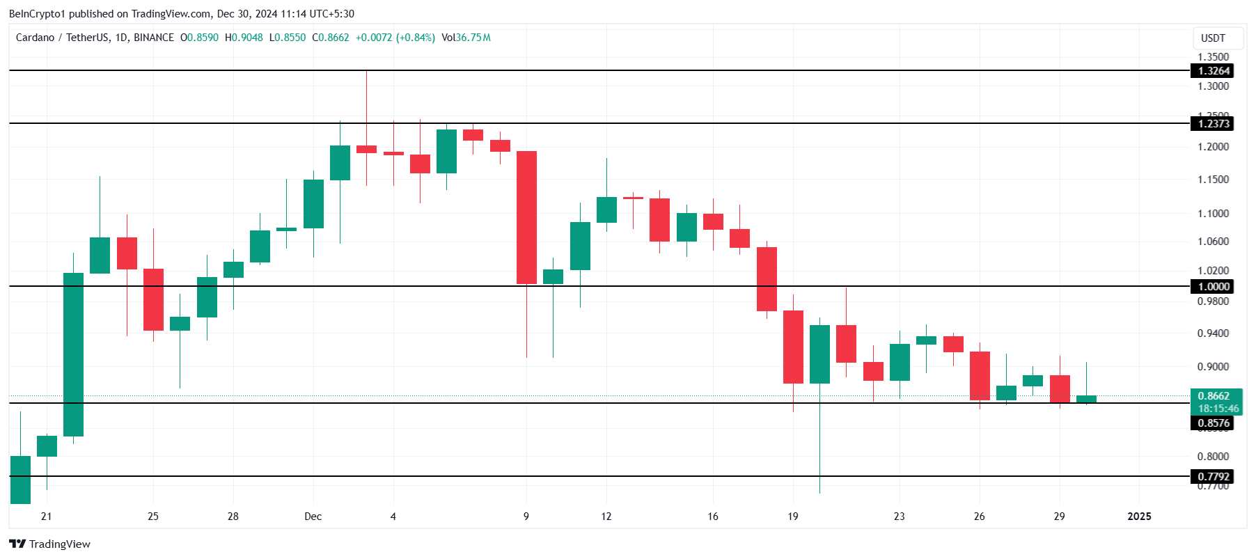 会議のタイミングが新年と重なることで、ADAが1.00ドルをサポートとして取り戻すための勢いを提供する可能性があります。現在、カルダノは重要な0.85ドルのサポートレベルを上回っており、市場のセンチメントと会議の結果次第で回復の可能性を秘めています。