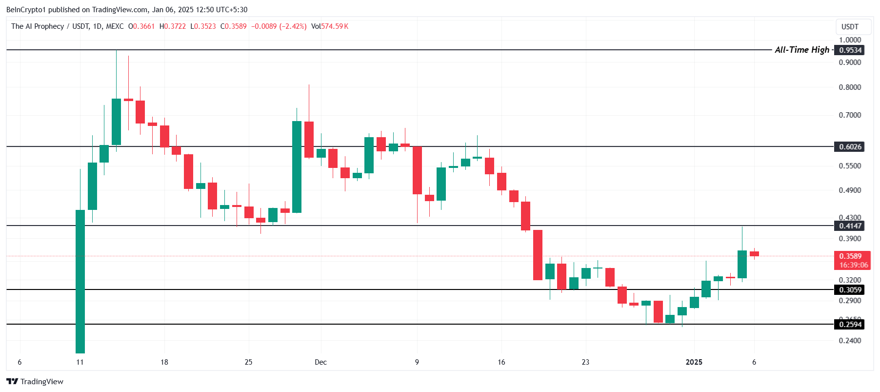 ACTは2024年12月末に0.25ドルのサポートレベルから反発し、現在0.35ドルで取引されています。アルトコインは現在0.41ドルの抵抗に近づいており、市場の勢いは近い将来の突破を示唆しています。