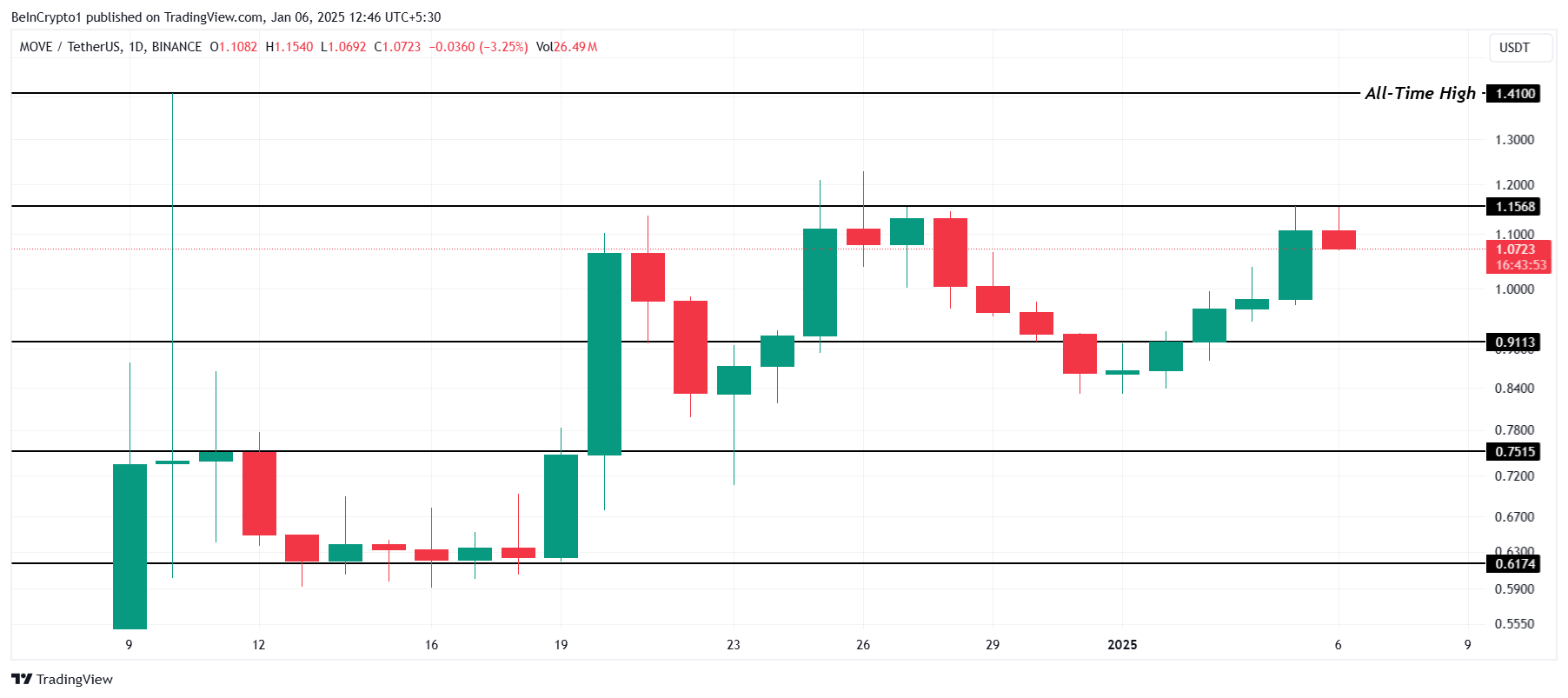 注目すべきもう一つの主要なアルトコイン、MOVEは、1.15ドルの障壁を1か月半以上下回っており、この重要なレベルを超えるのに苦労しています。トークンが1.15ドルを突破することは、1.41ドルの史上最高値を超えるために不可欠であり、この抵抗は投資家にとって重要な焦点となっています。