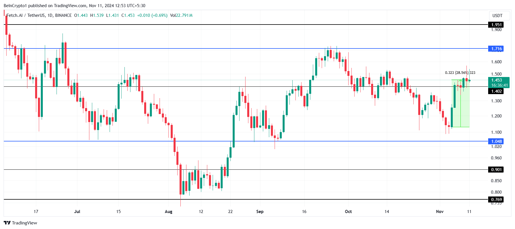 FETの価格は今週28.5%上昇し、FETを再び1.40ドルの重要なサポートレベルを超えた。次の抵抗は1.71ドルで、これを超えるとFETは2ドルのマークに向かう可能性があり、強い上昇傾向を示す。
