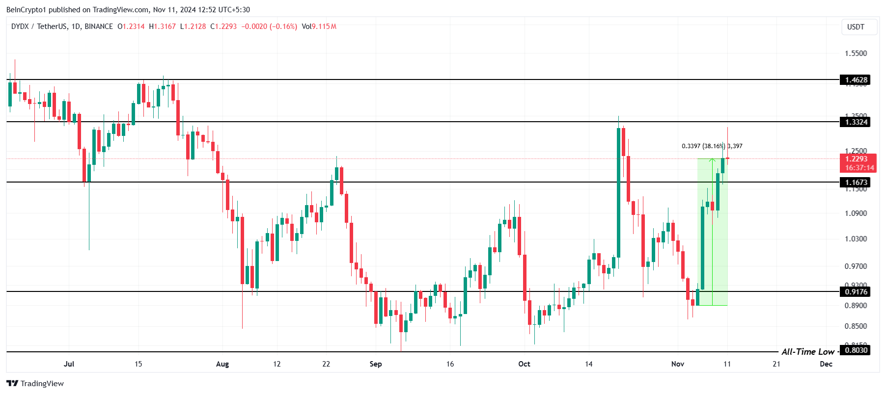 dYdXの価格は今週38%上昇したが、8月に確立された連固定範囲内に留まり、DYDXは1.33ドル以下で推移している。投資家は、より強い上昇トレンドを確認するために、ブレイクアウトの兆候を綿密に監視している。