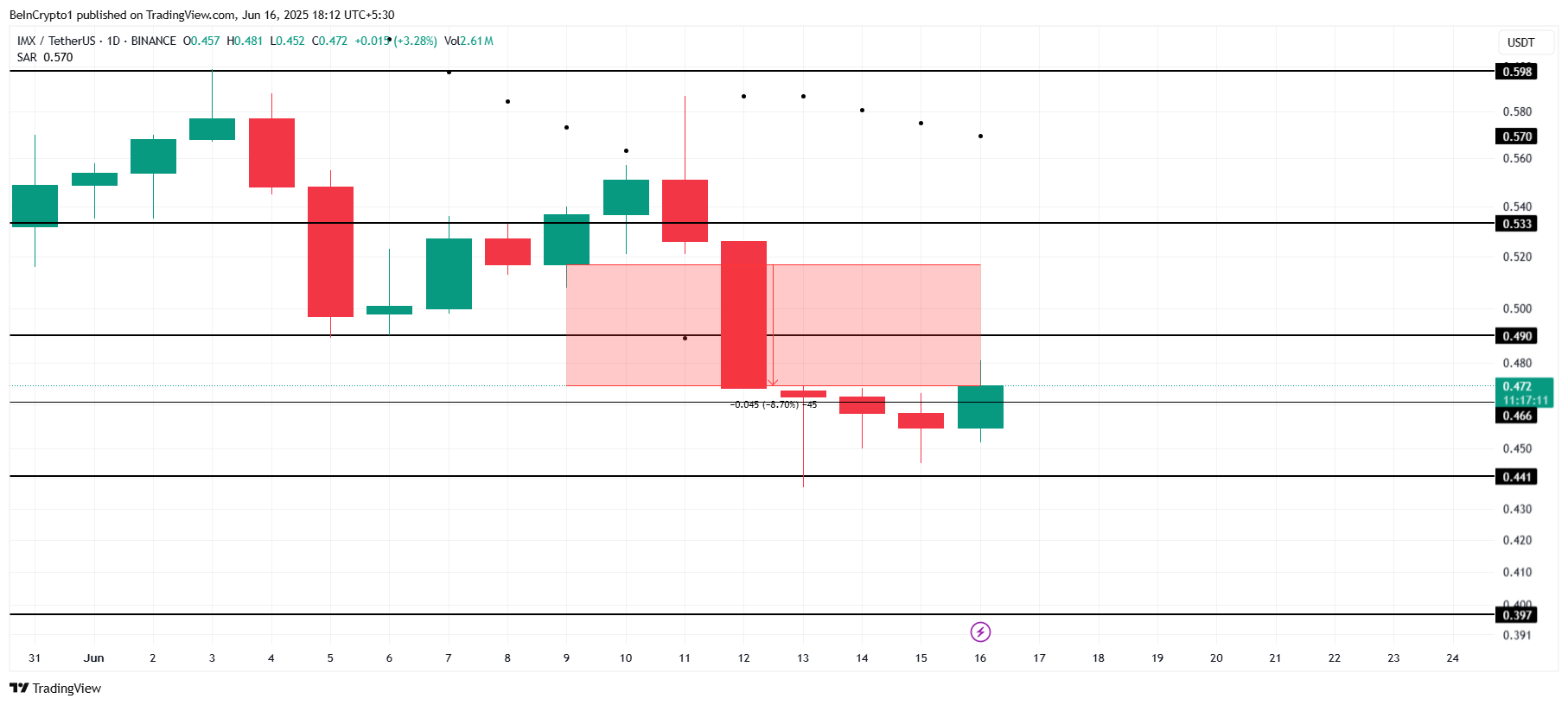 パラボリックSARは現在、ローソク足の上にあり、弱気トレンドの拡大を示している。このパターンが続く場合、IMXの価格はさらに下落する可能性がある。0.44ドルのサポートを下回ると、さらなる弱さを示し、上昇の見通しを無効にし、投資家にとって追加の損失のリスクが高まる。