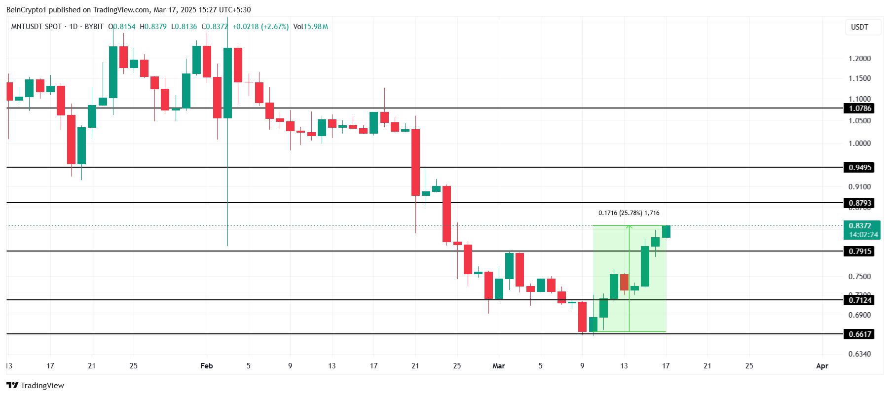 Sponsoredアップグレードに応じて、MNTはさらなる上昇を見込んでおり、1.00ドルに達する可能性がある。現在0.83ドルで取引されているこのアルトコインは、0.87ドルと0.94ドルの抵抗レベルを突破する必要がある。これらのレベルを上回ることができれば、上昇トレンドが確認される。