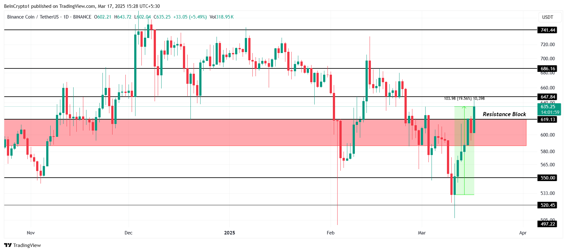 3月に注目すべきもう一つのアルトコイン、BNBの価格は今週19.5%上昇し、執筆時点で635ドルに達している。アルトコインは587ドルから619ドルの重要な抵抗ブロックを突破した。上昇の勢いが高まる中、BNBはさらなる上昇の準備が整っているように見える。市場条件が今後数日間で好ましいままであれば。