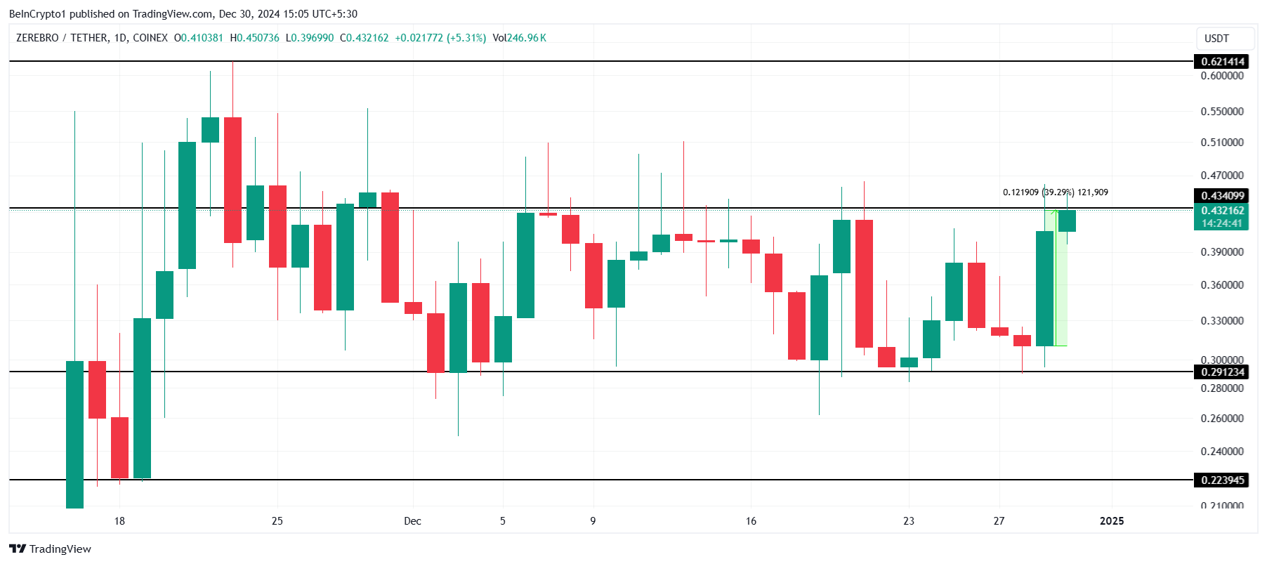 永久先物の開始は大きな影響を与え、ZEREBROの価格は過去24時間で約40%急騰しました。この急騰にもかかわらず、アルトコインは依然として統合段階にあり、$0.434から$0.291の範囲で取引されており、ブレイクアウトのための強い手がかりを待っています。