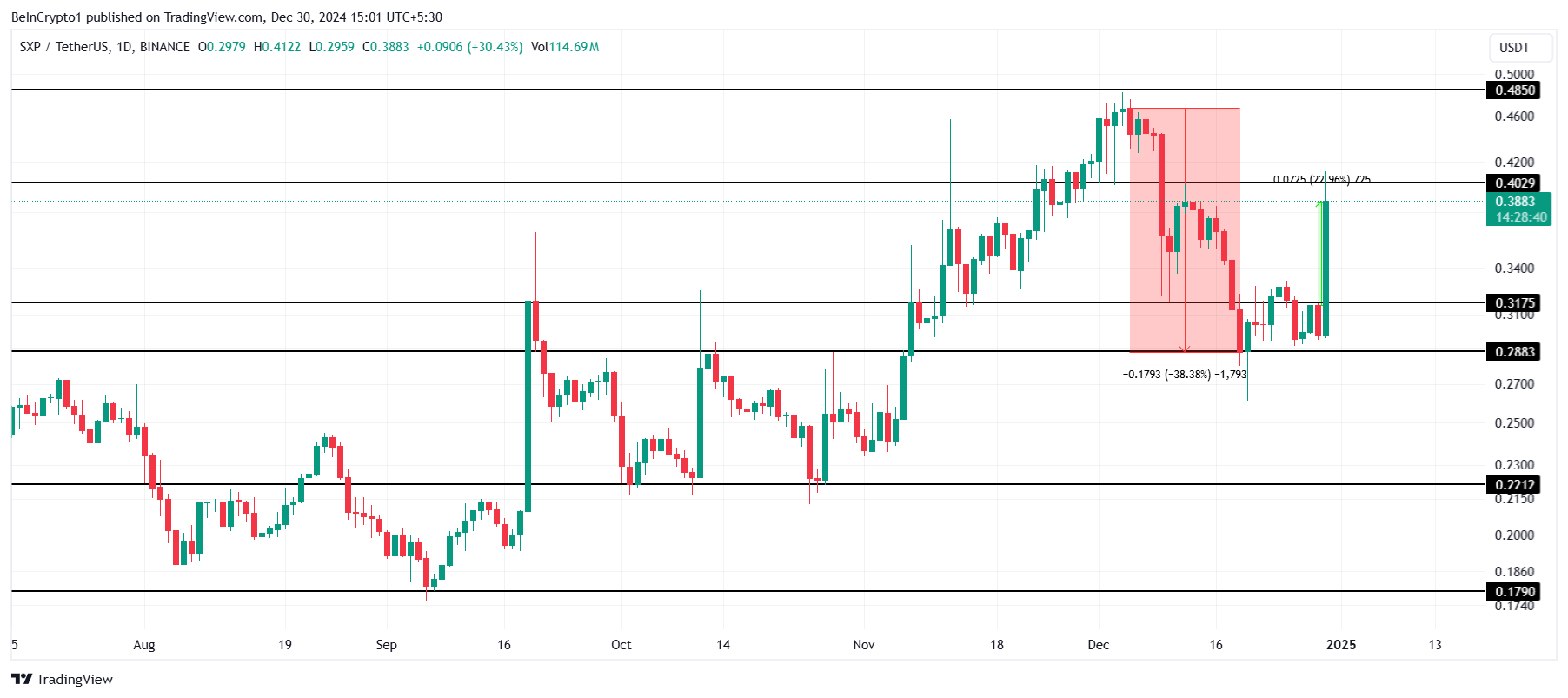SXPの価格は過去24時間で約23%急騰しました。これは、Solarの年末報告書が2024年の強い見通しを示したことによるものです。このポジティブな見通しは投資家の信頼を高め、SXPを今日の注目のアルトコインの一つとして位置づけています。