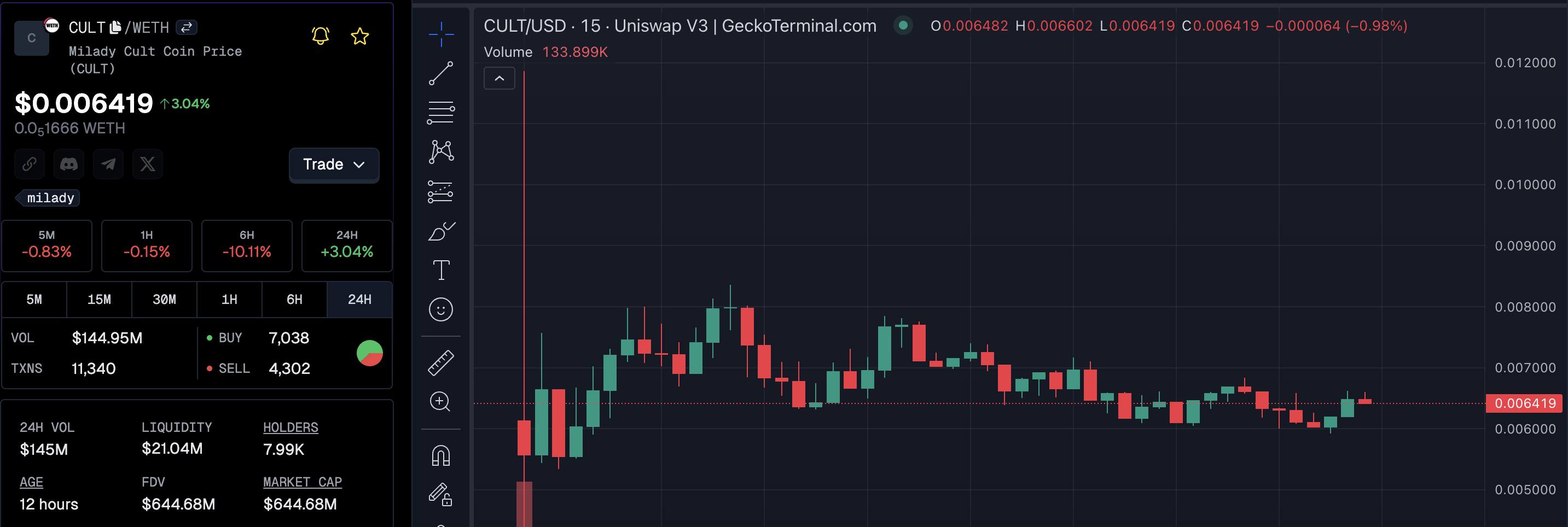 GeckoTerminalによれば、イーサリアム上でローンチされたアルトコインは、時価総額が6億ドルを超えている。取引量は1億4497万ドルで、価格は$0.0065で取引されている。