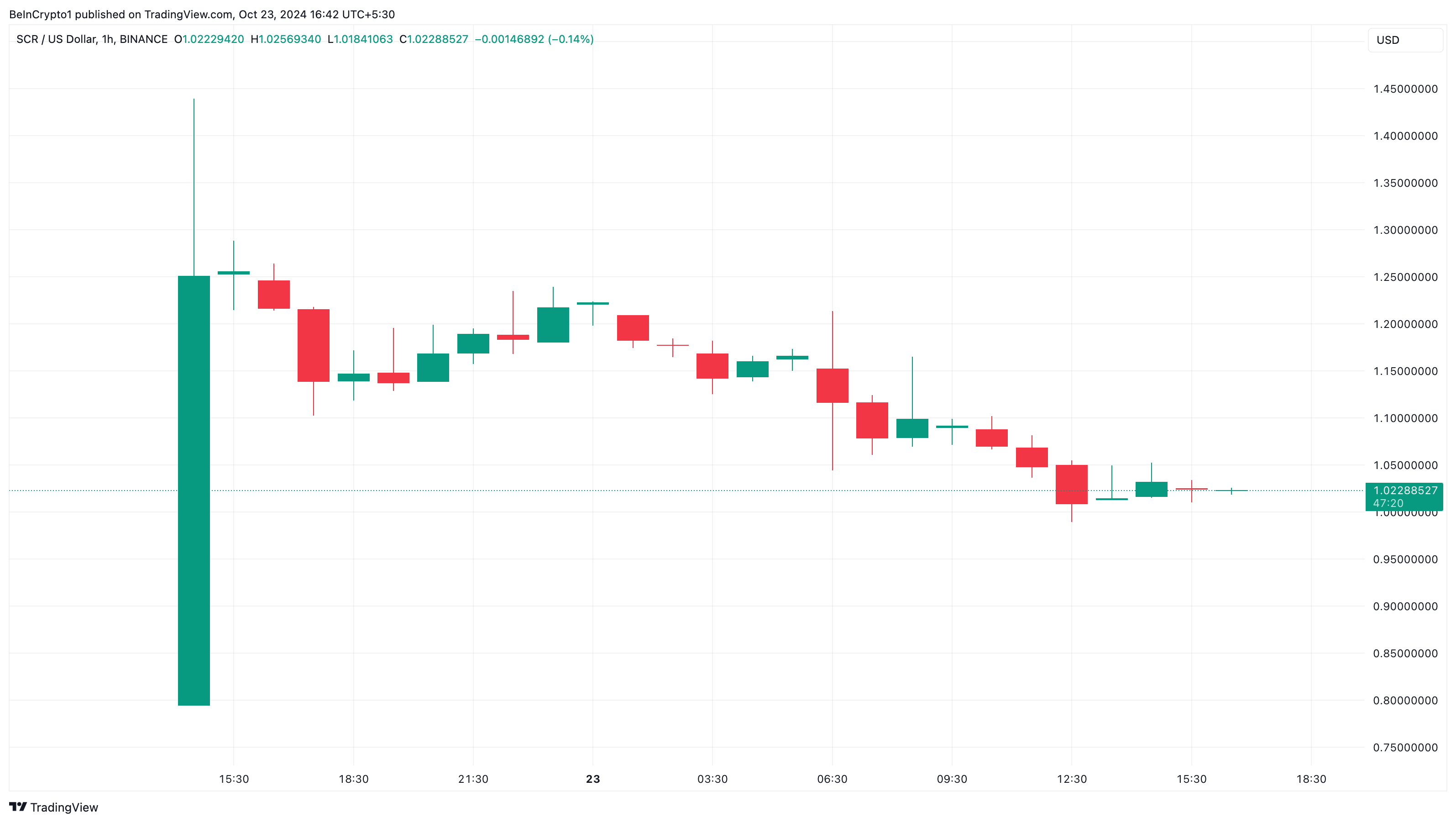 現在、Scrollの価格は1時間チャートで1.02ドルです。しかし、トレンドは潜在的な下落を示唆しており、価格が1ドル以下に落ちる可能性があります。下降の勢いが続けば、0.85ドルへの移動が見込まれます。