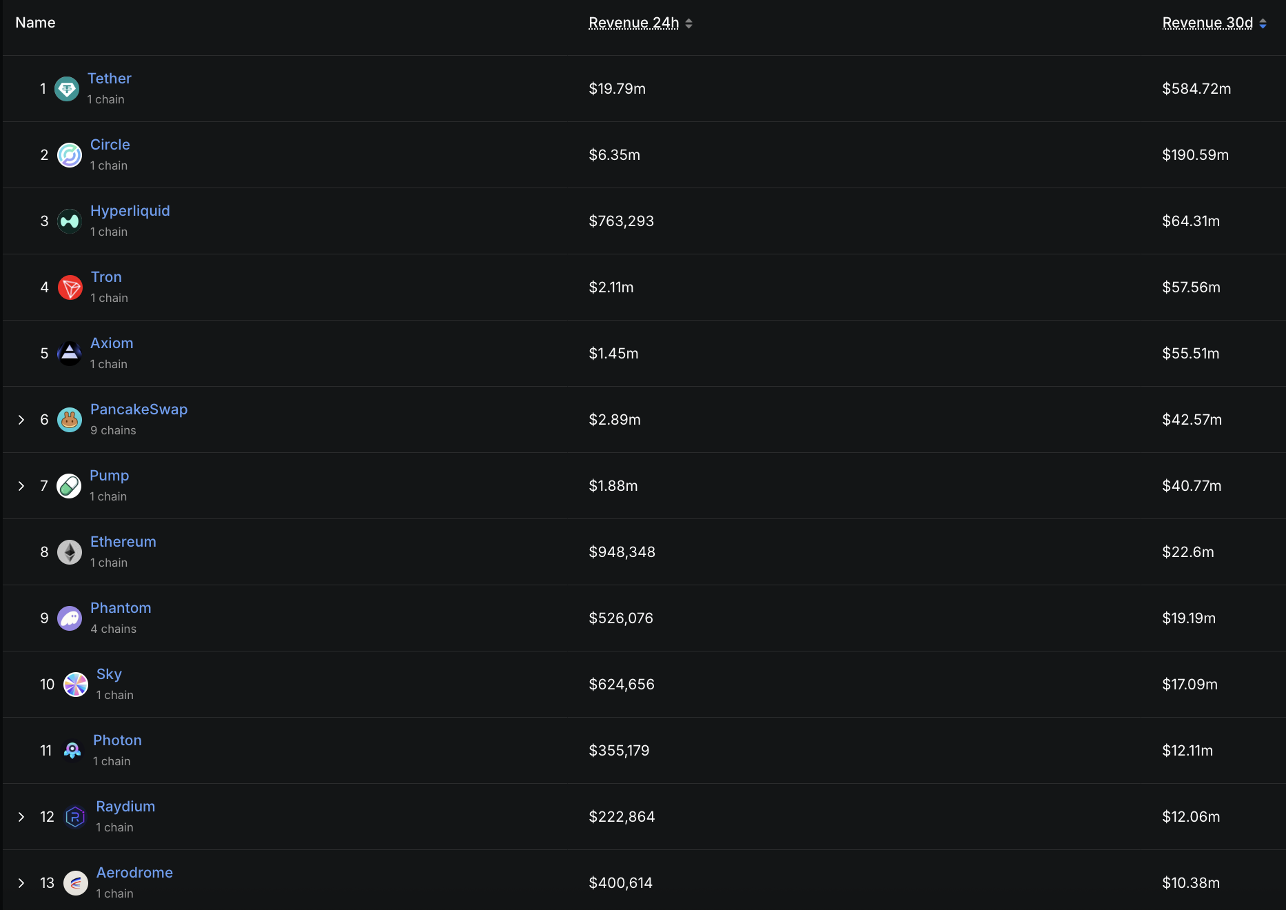 これにより、ハイパーリキッドはトロン、アクシオム、パンプ、パンケーキスワップといった他の主要プレイヤーを上回り、業界の主要な収益エンジンとしての地位を固めている。