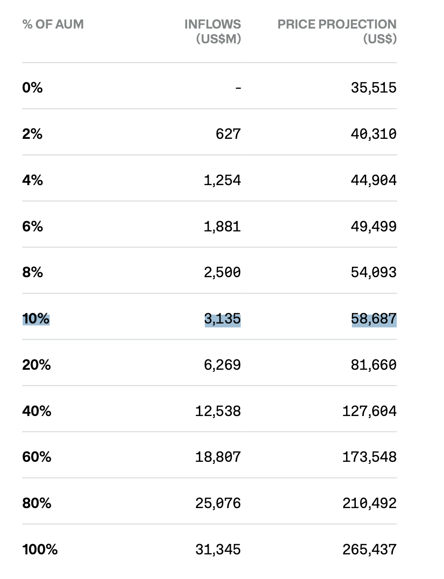 コインシェアーズのアナリストは、現在の運用資産(AUM)の10%が流入することで、BTC価格が60,000ドル近くになる可能性があると予測した。