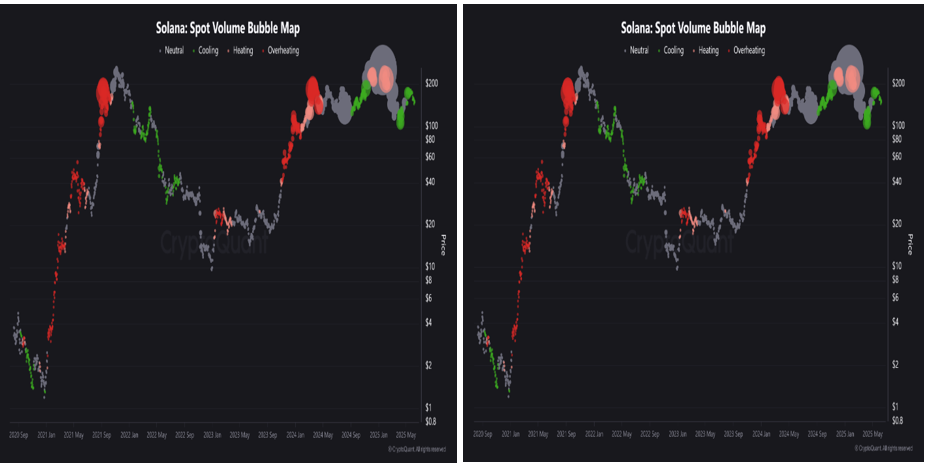 CryptoQuantのバブルマップによると、ソラナの現物および先物取引量は最近数週間で減少している。
