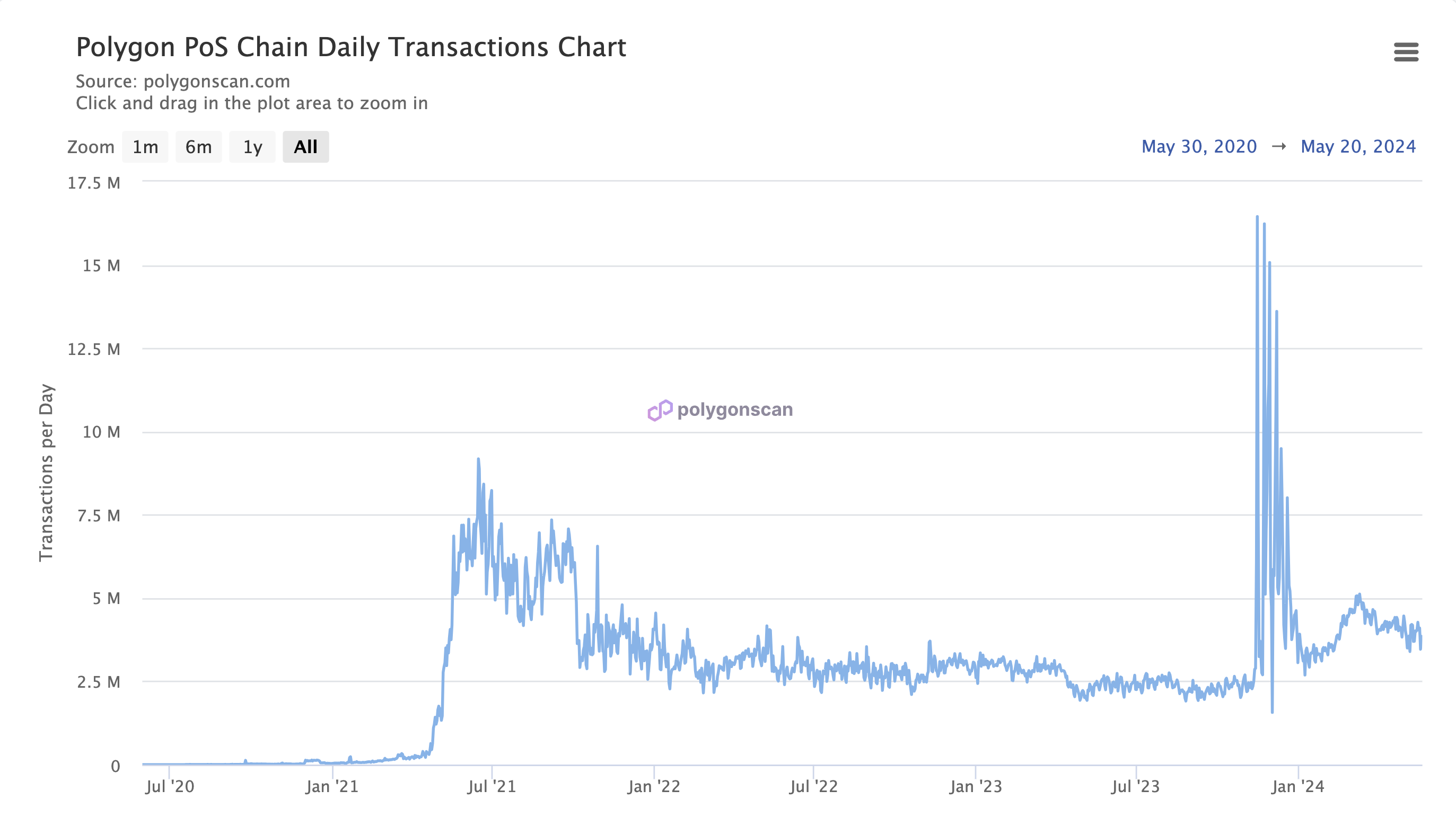 日次トランザクションチャートは、ポリゴン(MATIC)ネットワークにおける大きな活動を示しており、顕著なスパイクは利用が多い期間を示している。