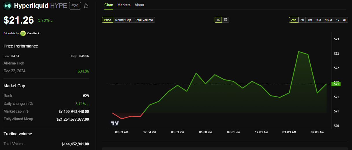 BeInCryptoのデータによると、このニュースを受けてHyperliquidのHYPEトークンは3%以上急騰しました。本稿執筆時点で、HYPEは21.26ドルで取引されていました。
