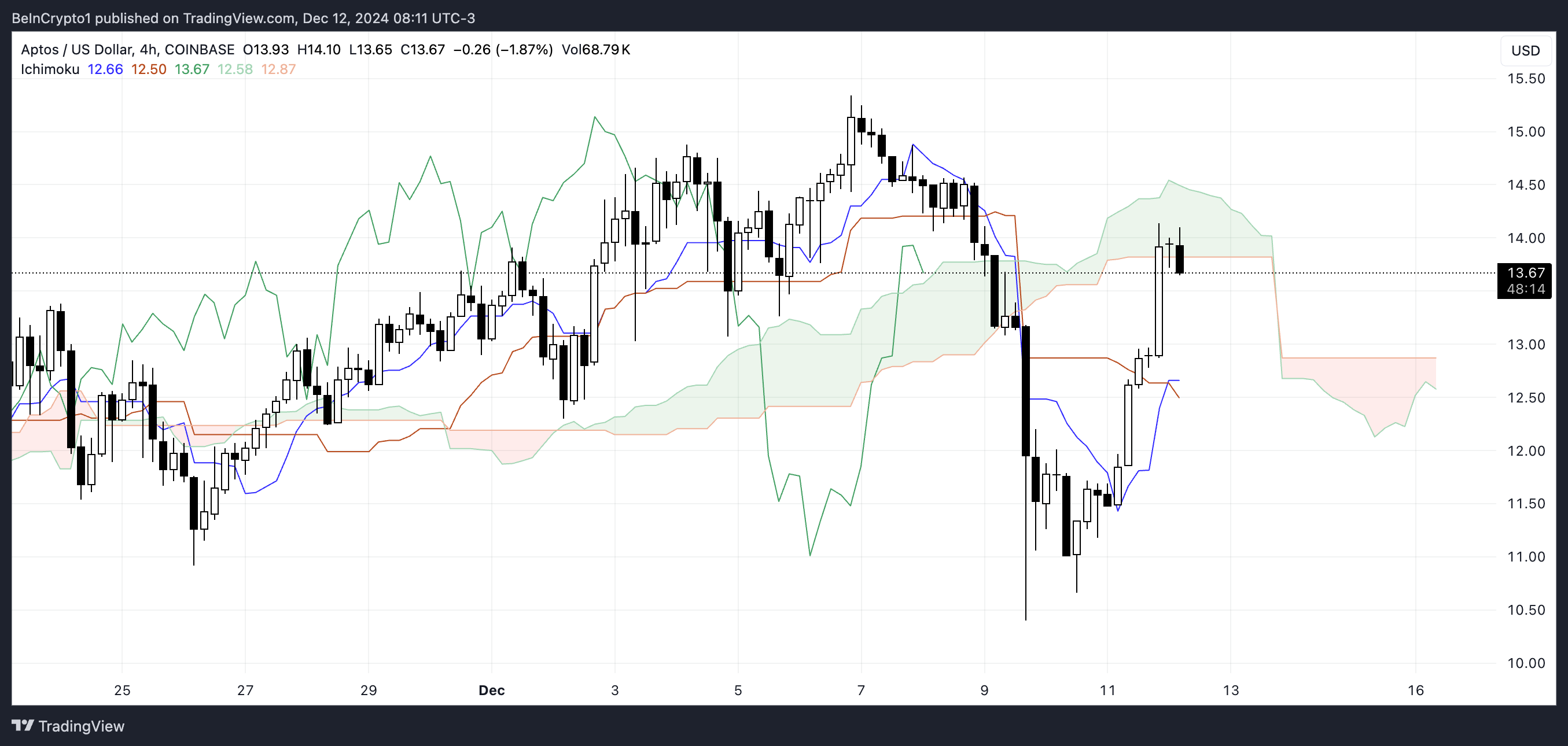 このAptosの一目均衡表チャートは、価格が雲のわずか上で取引されており、強気のバイアスを示している。先行する緑の雲は潜在的なサポートを示し、雲の比較的平坦な上部は14ドル近くの抵抗が重要であることを示している。