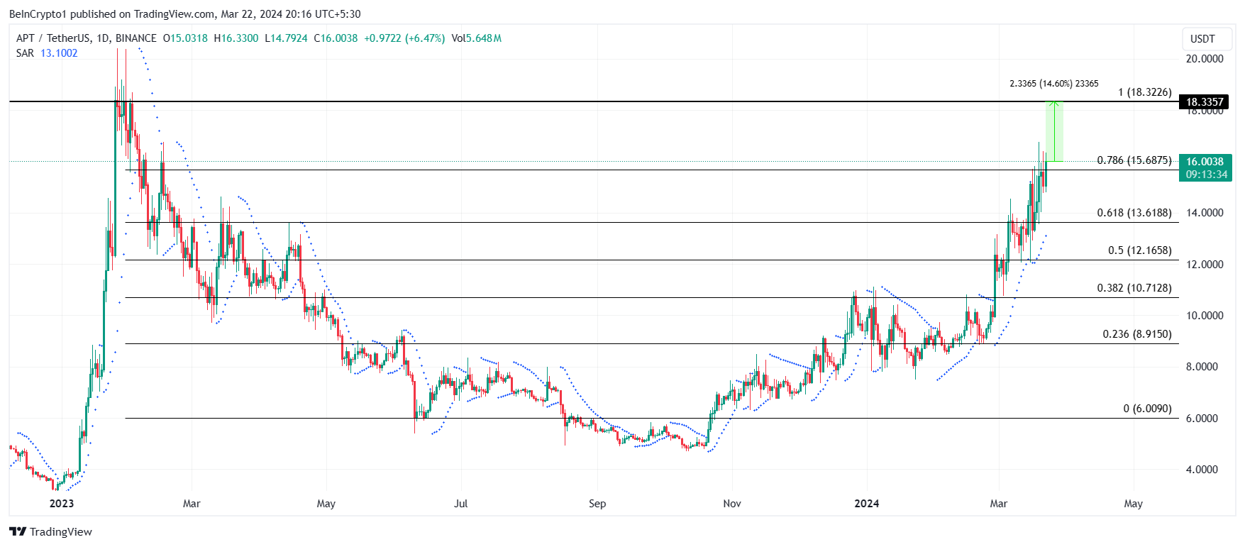 Aptos価格は19.92ドルの史上最高値まであと20%未満です。これは2023年1月にAPTが到達した現在の天井である。この障壁を突破することは、暗号通貨が史上最高値を更新しただけでなく、20ドルに達するのも近いことを意味する。