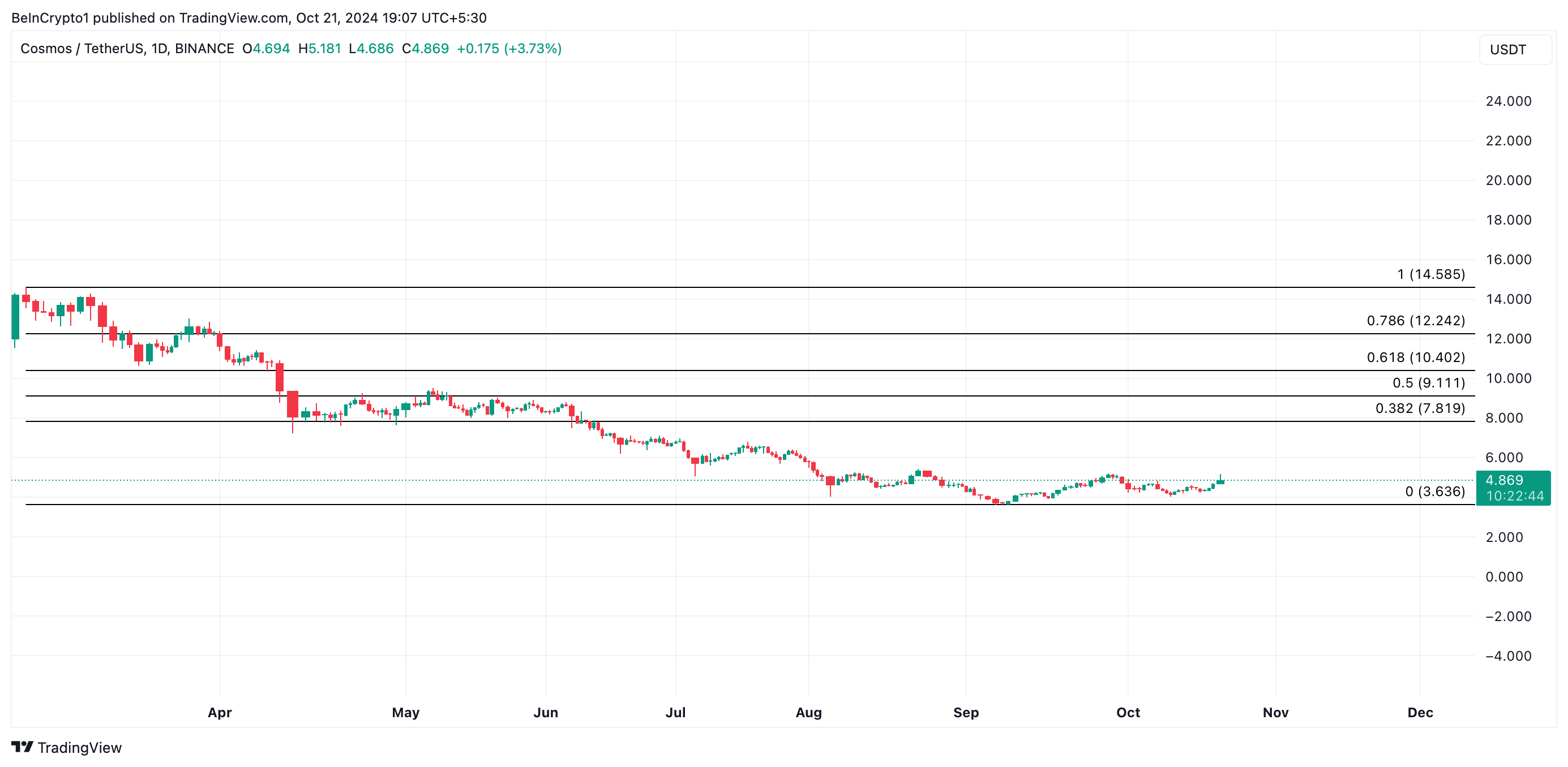 もしATOMの買い勢いが続くならば、フィボナッチリトレースメント分析は4ヶ月ぶりの高値である7.81ドルを重要な価格目標として示しています。このレベルを超えるブレークアウトが起こると、トークンは3月以来達成していない14.58ドルへと押し上げられる可能性があります。