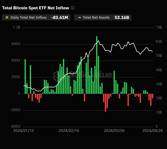 SoSo Valueのデータによると、ビットコインスポットETFは先週、3日連続で合計ネットフローがマイナスを記録した。iシェアーズ・ビットコイン・トラスト(IBIT)、ブラックロックのスポットビットコインETF、トップパフォーマンスのETFの一つであるが、2024年4月24日以来、流入はゼロである。