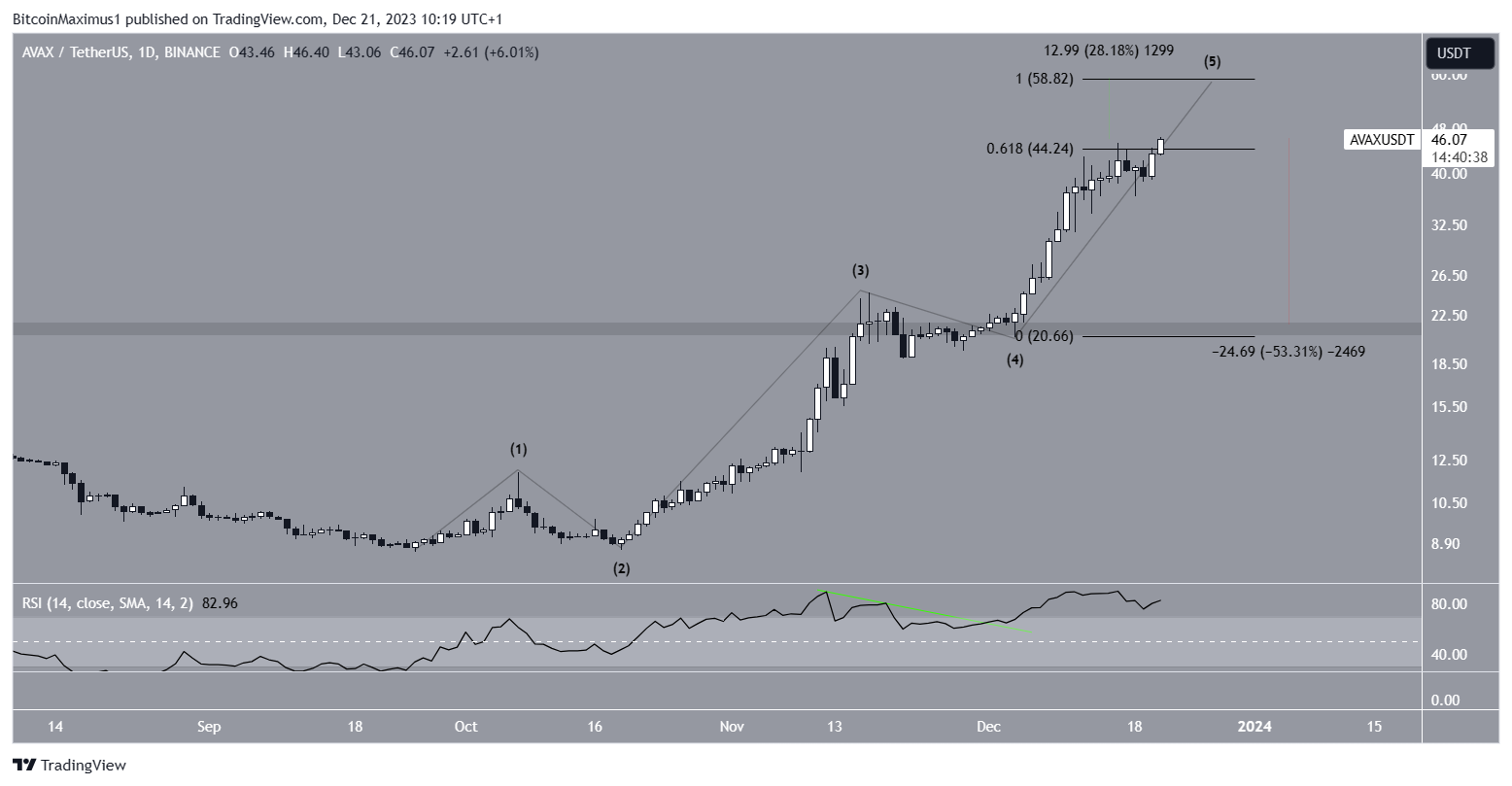 Sponsored SponsoredAVAXが増加を続ければ、次のターゲットは59ドルになり、波動5は波動1と3の合計と同じ長さになります。これはさらに28%の上昇に相当する。AVAX価格が上昇率を維持すれば、12月に目標に達する可能性がある。