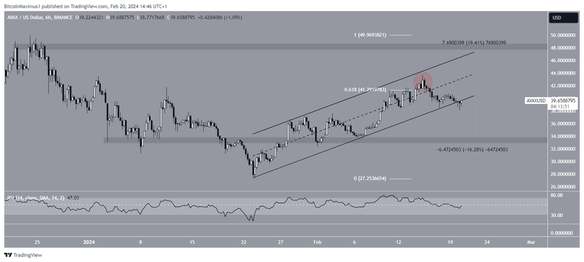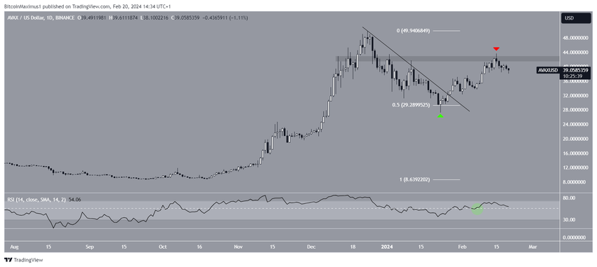 その後、AVAXは上昇し、0.5フィブリトレースメントのサポートレベル(緑色のアイコン)を検証し、下降抵抗トレンドラインから抜け出した。AVAXの価格はわずかに減少する前に、上昇の動きは2月15日に43.62ドルの高値で最高潮に達した。