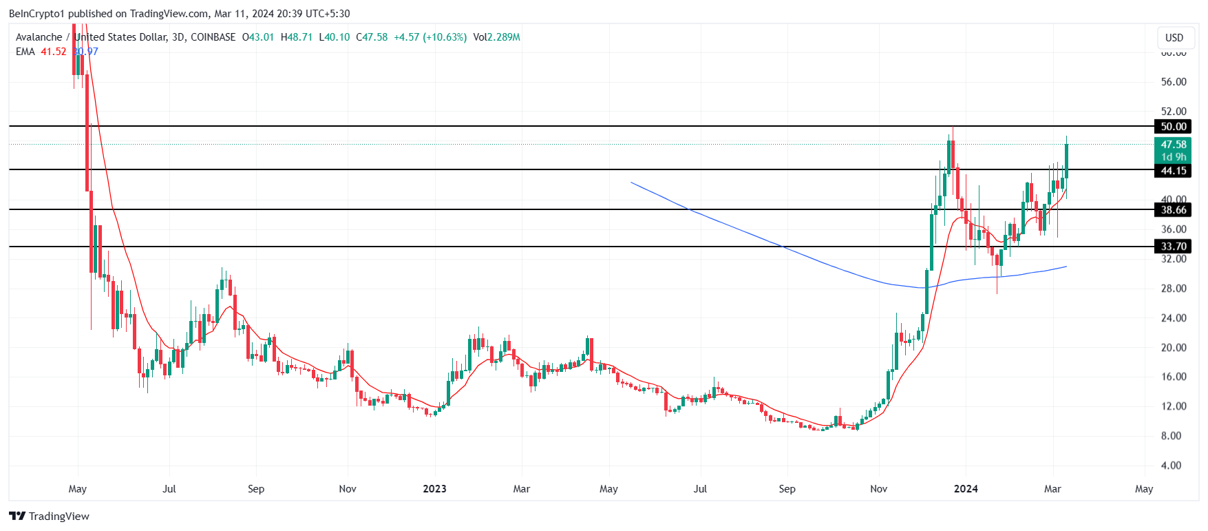 本稿執筆時点で47ドルで取引されているアバランチ価格は、過去24時間で10.6%以上上昇し、その日のうちに44ドルのレジスタンスを超えた。このアルトコインの次の壁は50ドルと言われており、これは重要な心理的抵抗であるだけでなく、重要なテクニカルレベルでもある。