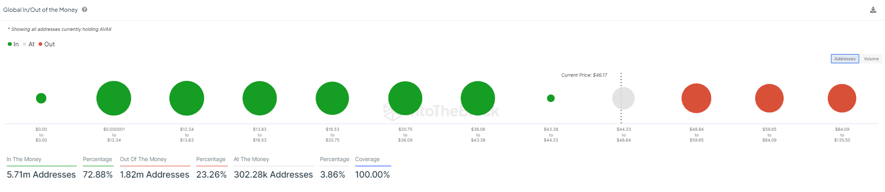 ほとんどの「資金不足」保有者はAVAXを54ドルで購入した。現在の損失保有者のブロックは、2800万AVAXを保有する653,000アドレスに相当する。しかし50ドルに向かってプッシュすると、その抵抗ゾーンが48.33ドルで始まるように、これらのホルダーの約3分の1が “お金に “戻るだろう。