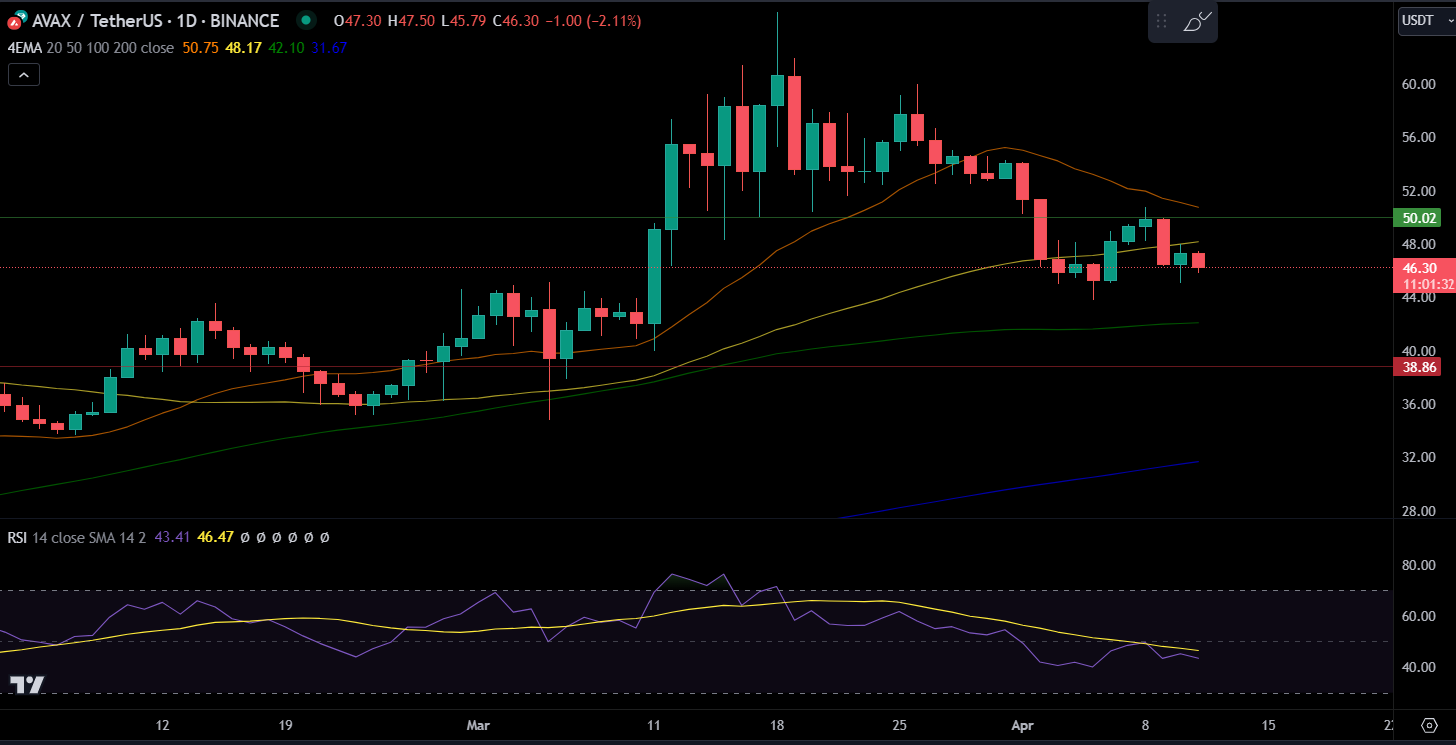 しかし、相対力指数(RSI)は、AVAXが売られすぎでも買われすぎでもなく、中立のシグナルを発していることを示唆している。現在、RSIは48に位置している。RSIはモメンタム指標で、最近の価格変動の大きさを測定し、買われすぎや売られすぎの状況を分析する。