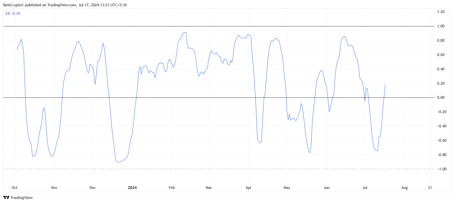 資産が正の相関を示すとき、それは一方の資産の価格が上昇するとき、もう一方の資産も上昇する可能性が高いことを意味します。この場合、ビットコインが上昇トレンドを続けると、BANANAもそれに追随し、ビットコインの回復の恩恵を受けると予想されます。