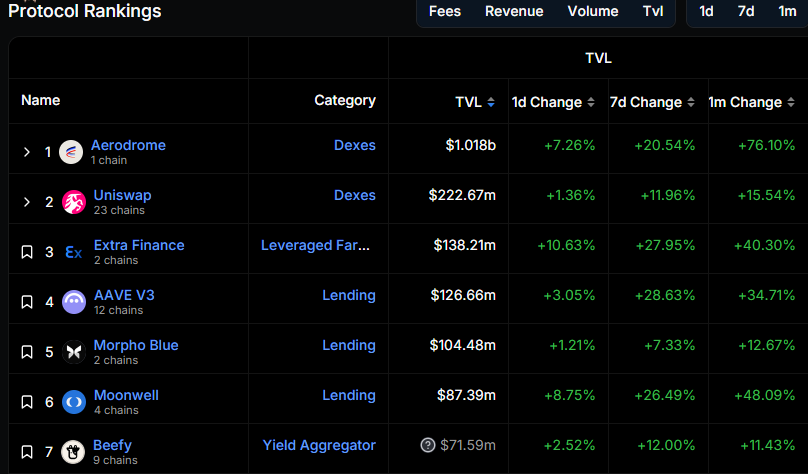 AerodromeはBase L2の主要なプロトコルで、TVLは10億1800万ドルを誇り、先月は76%増加しました。Baseの他のプロトコルには、 Uniswap とAave V3が含まれ、CoinbaseのビットコインラッパーであるcbBTCがまもなく統合される可能性があります。
