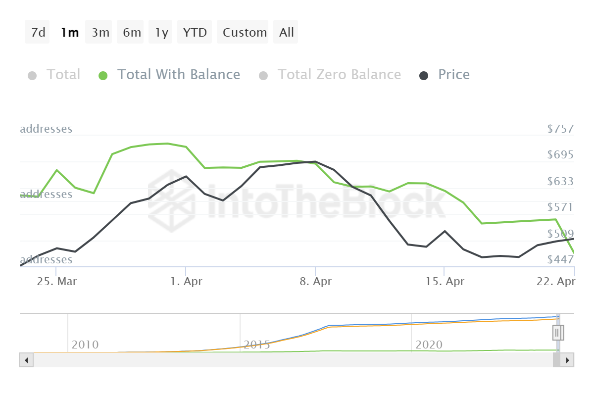 Sponsoredこれは、3月の上昇の後、市場が冷え込むにつれて、アルトコインが調整されることになったためである。その結果、投資家は損失に耐えるために資産への投資から撤退した。これにより、総アドレス数は2,516万から2,477万に減少した。