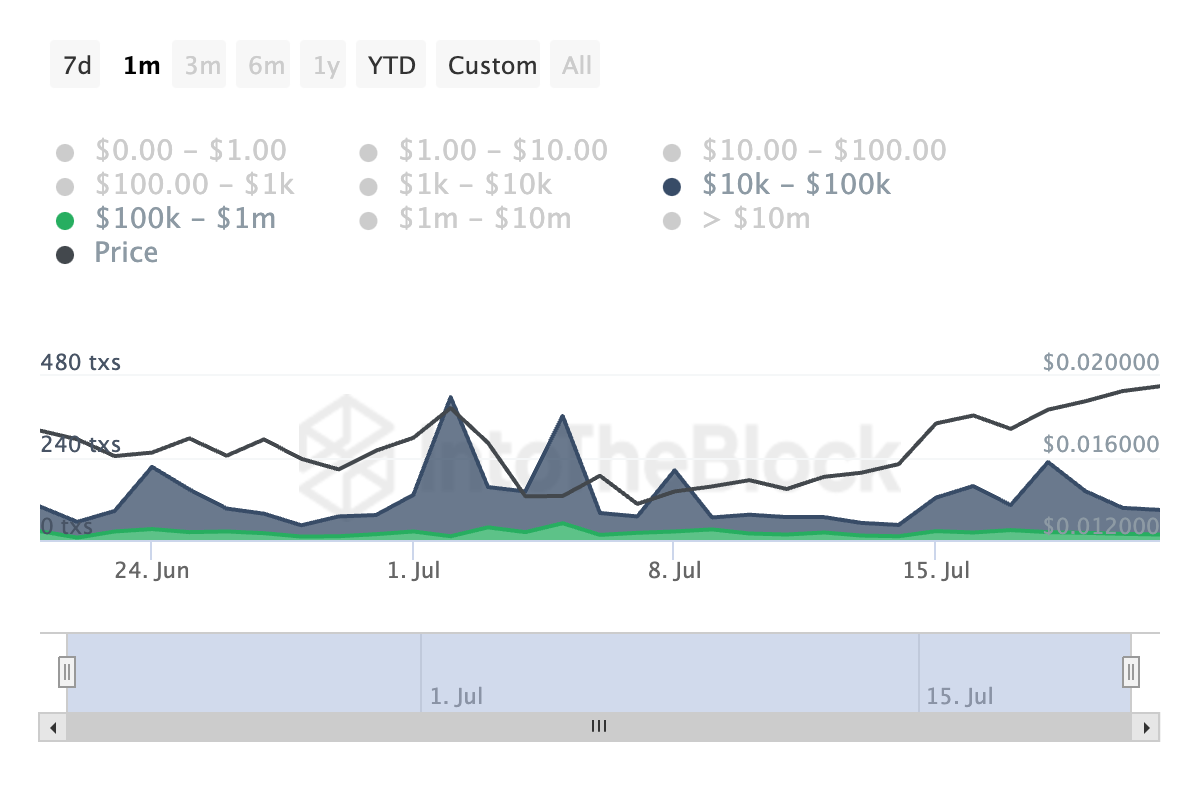 IntoTheBlockのデータによると、過去1カ月間、BEAMの1日の大口取引数が増加している。ちなみに、1万ドルから10万ドルのBEAM取引の日次件数は、過去30日間で57%増加している。同期間中、10万ドルから100万ドルの大口取引は129%増加している。