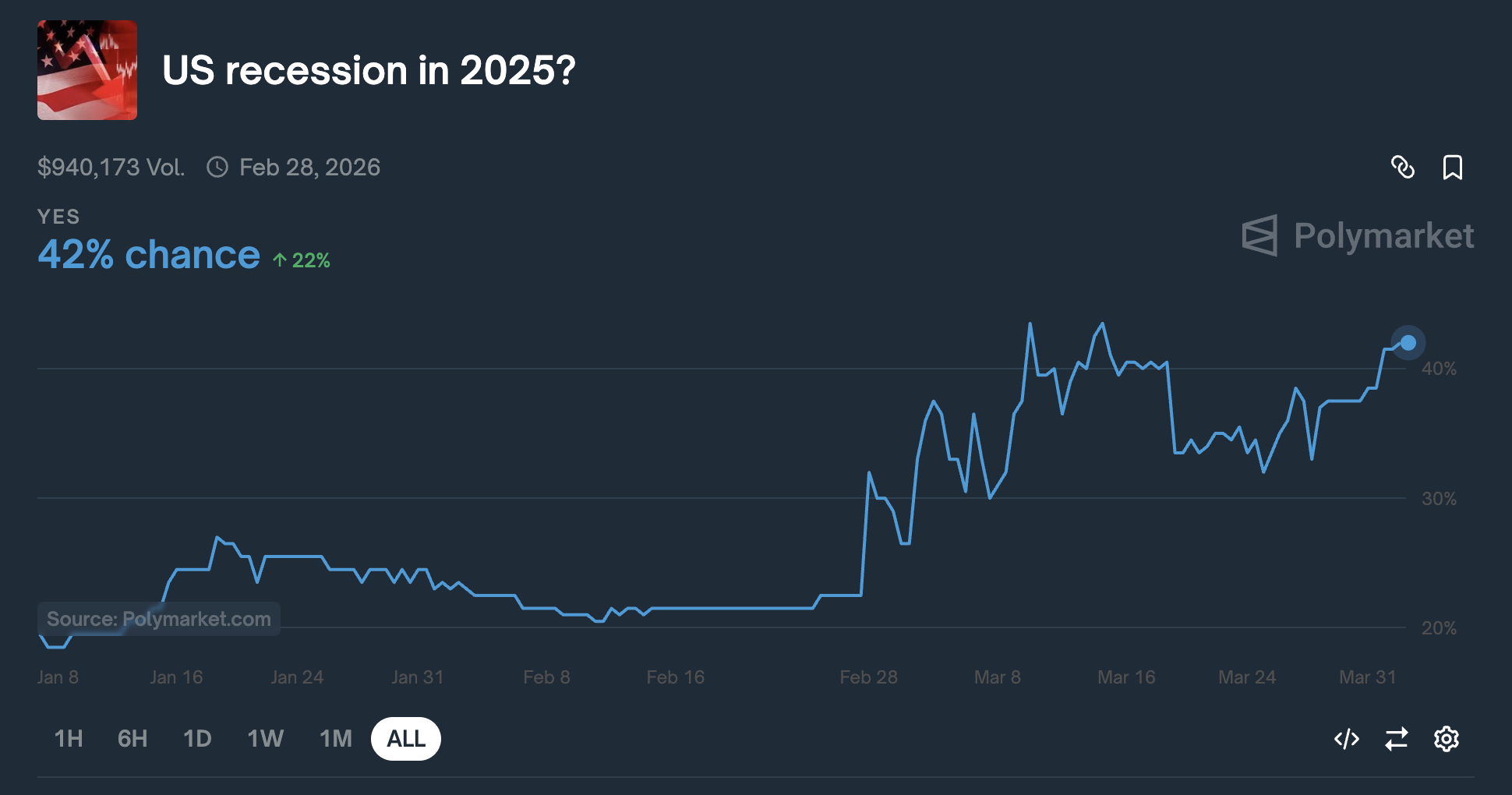 2025年の米国景気後退の可能性は、3月28日の33%から今日の42%に跳ね上がった。