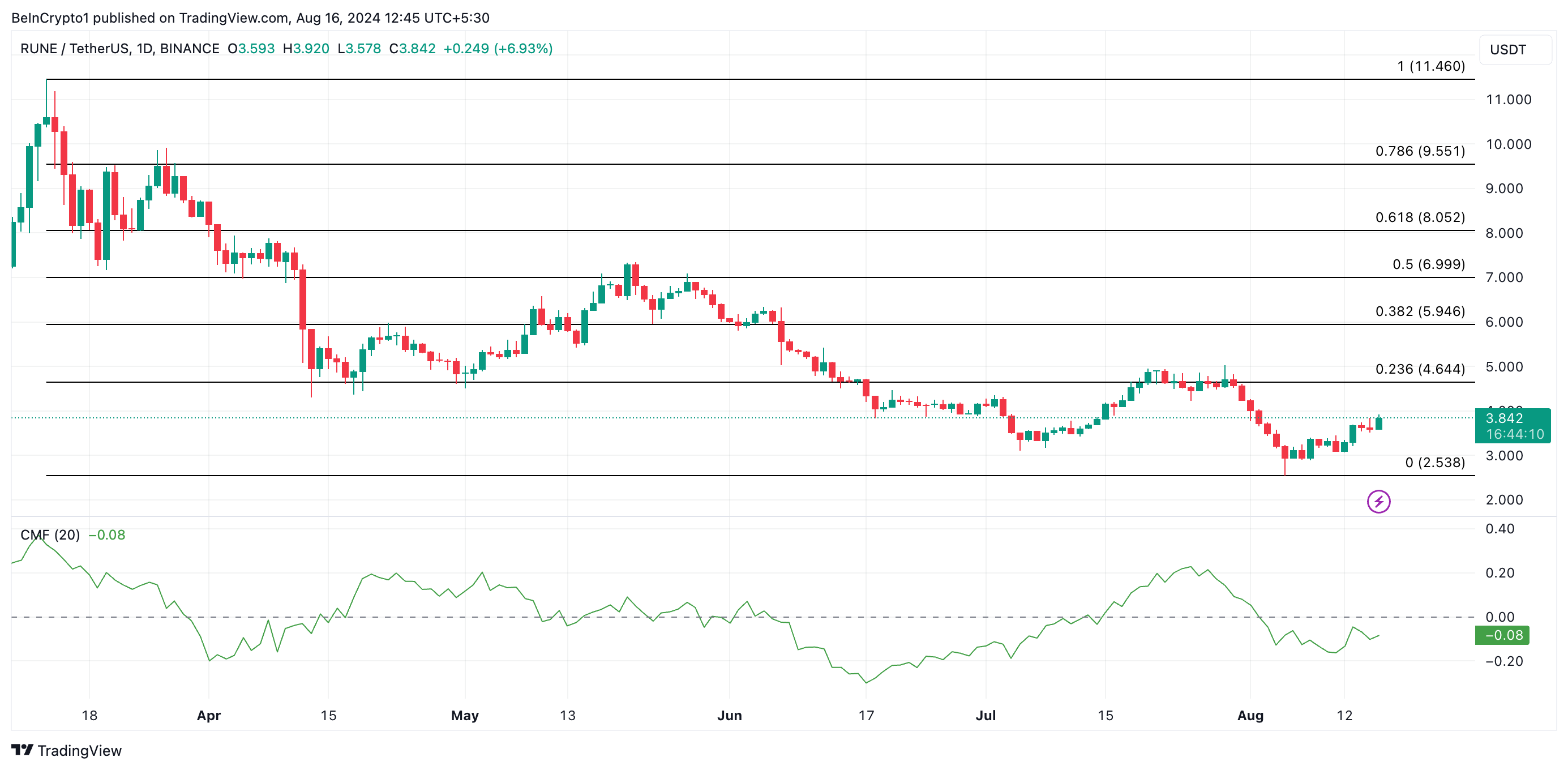 RUNEの価格は今週16%上昇し、7日間の高値3.90ドルに達した。しかし、この成長にもかかわらず、チャイキン・マネー・フロー(CMF)の低下は反転の可能性を示唆している。