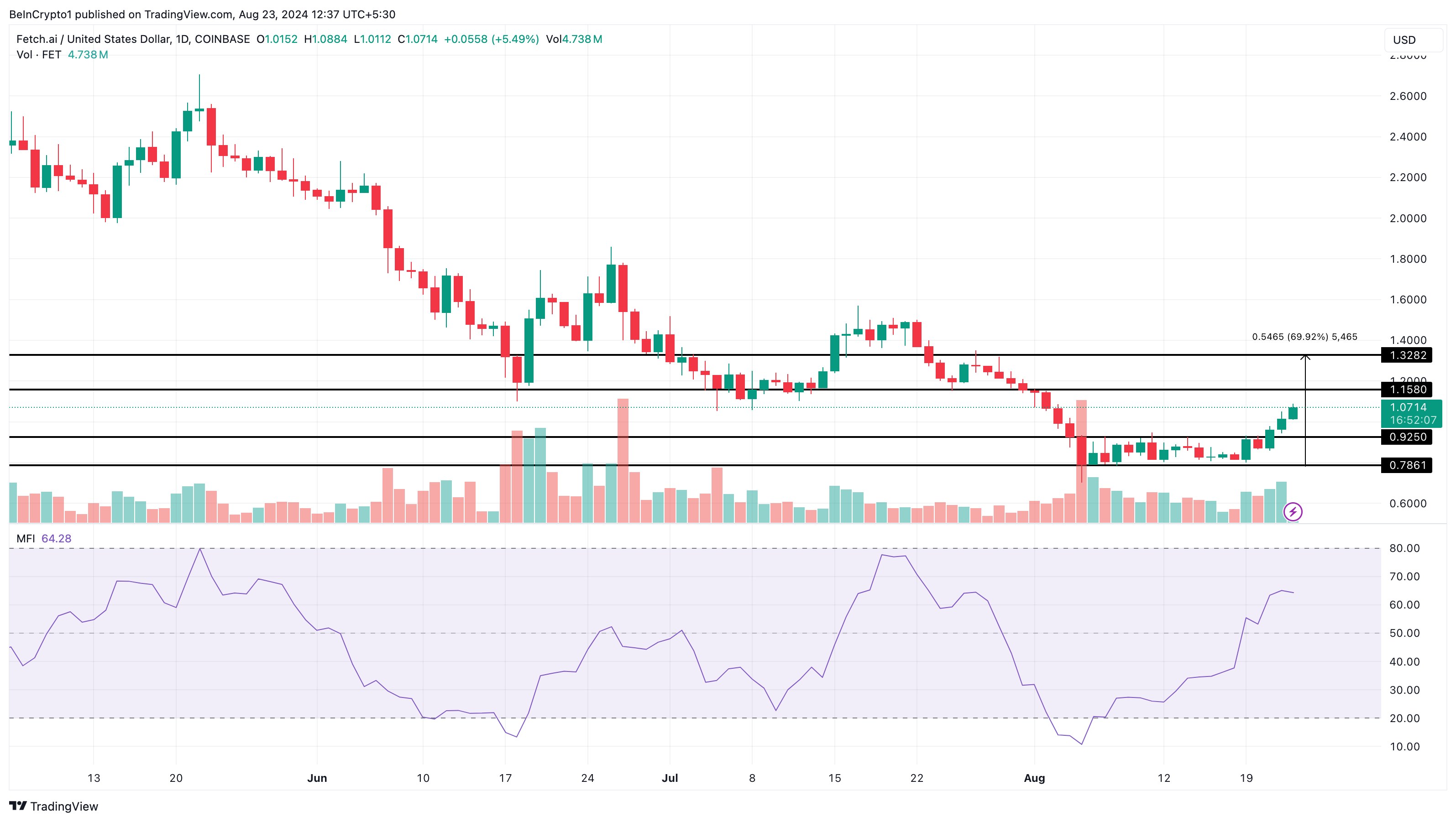 FETは現在1.07ドルで取引されており、最近の上昇は資金流入の増加によるものと思われる。日足チャートでは、マネーフロー指数(MFI)が8月に入って以来の高水準にある。この急騰は、投資家の強い関心と市場参加を反映し、価格上昇がかなりの買い量に支えられていることを示している。
