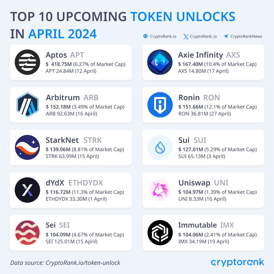 レイヤー1ネットワークのAptosは、4月12日におよそ4億1,875万ドル相当の2,484万トークンのリリースを予定しており、その主導権を握っている。一方、Axie Infinityは、4月17日に1,480万AXSトークン(約1億6,740万ドル相当)を公開する予定です。