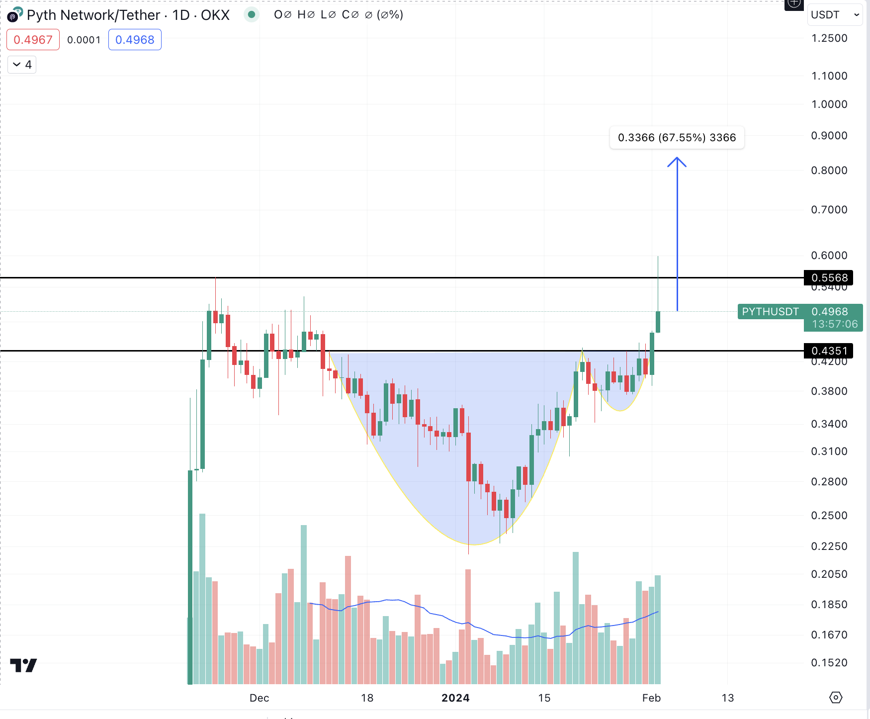 PYTHのテクニカル分析は、有望な見通しを明らかにしている。トークンは最近、強気のテクニカル指標であるカップ・アンド・ハンドル形成からブレイクアウトしており、大幅な価格上昇の可能性を示唆している。