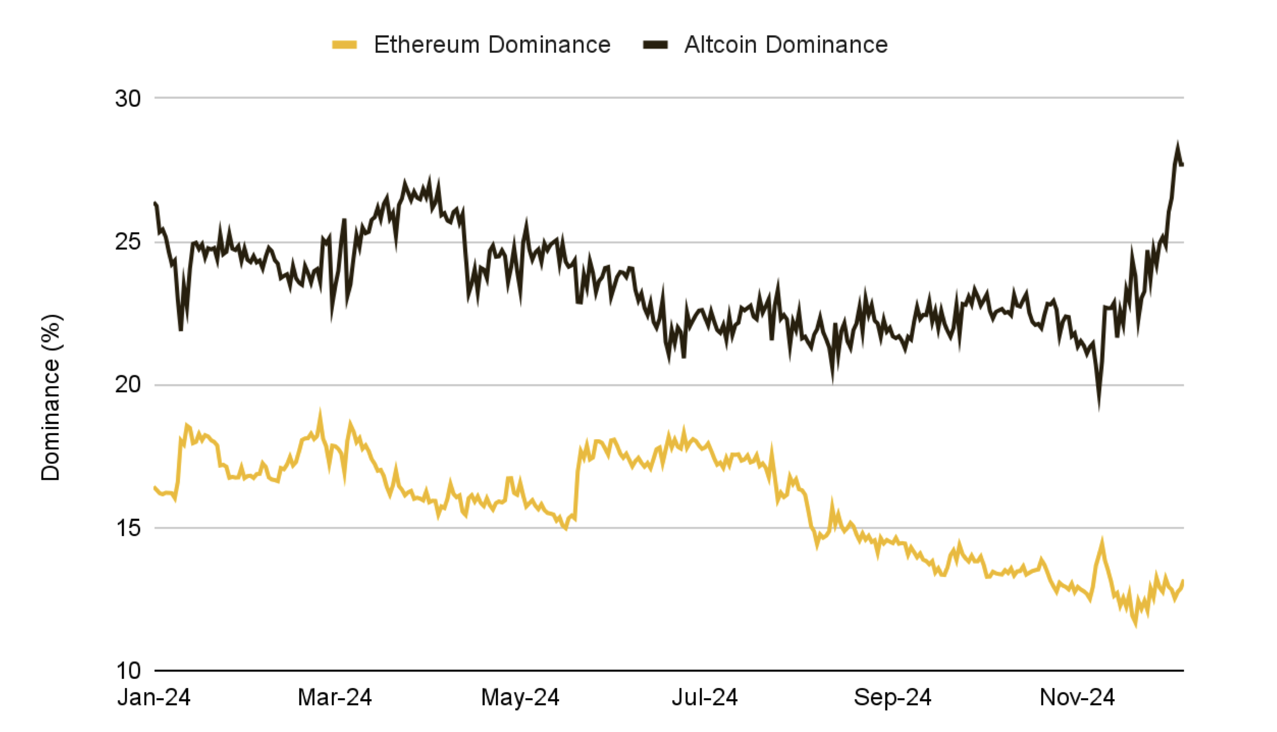 「イーサリアムの支配力は、総暗号資産市場の時価総額に対するその市場価値として測定され、年を通じて下降傾向にあり、13.1%という数年ぶりの低水準に達している。この低下は、リスクオンの感情が高まる上昇傾向のマクロ背景に対して特に顕著である」とレポートは述べている。