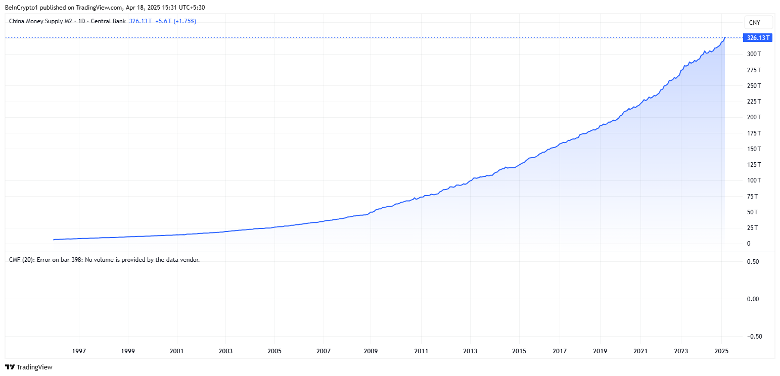 TradingViewのデータによると、中国のM2マネーサプライは326兆ドルに達し、過去最高値を更新し続けている。