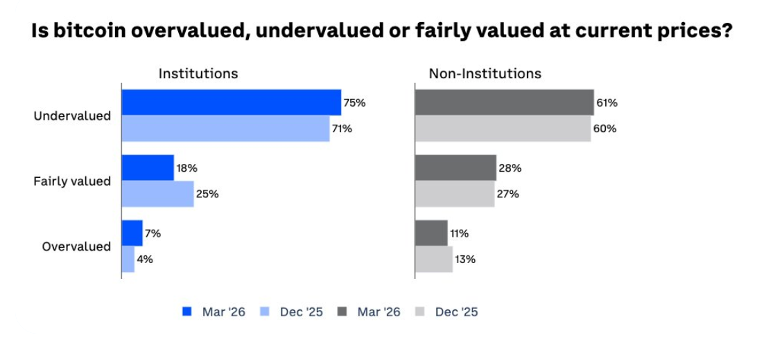 Coinbase InstitutionalとGlassnodeは、ビットコインが底値を形成しつつある可能性を指摘している。センチメントは「恐怖」から「楽観」へと転じ、調査対象の投資家の4分の3が現在のBTC価格を過小評価とみなしている。