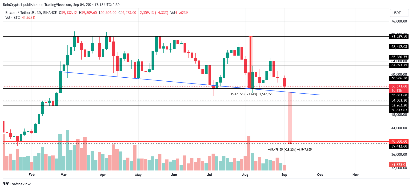 ビットコイン(BTC)の価格は、マクロ時間枠で安値を下回った後、半減したにもかかわらず史上最高値を更新できなかった後、現在56,500ドルです。